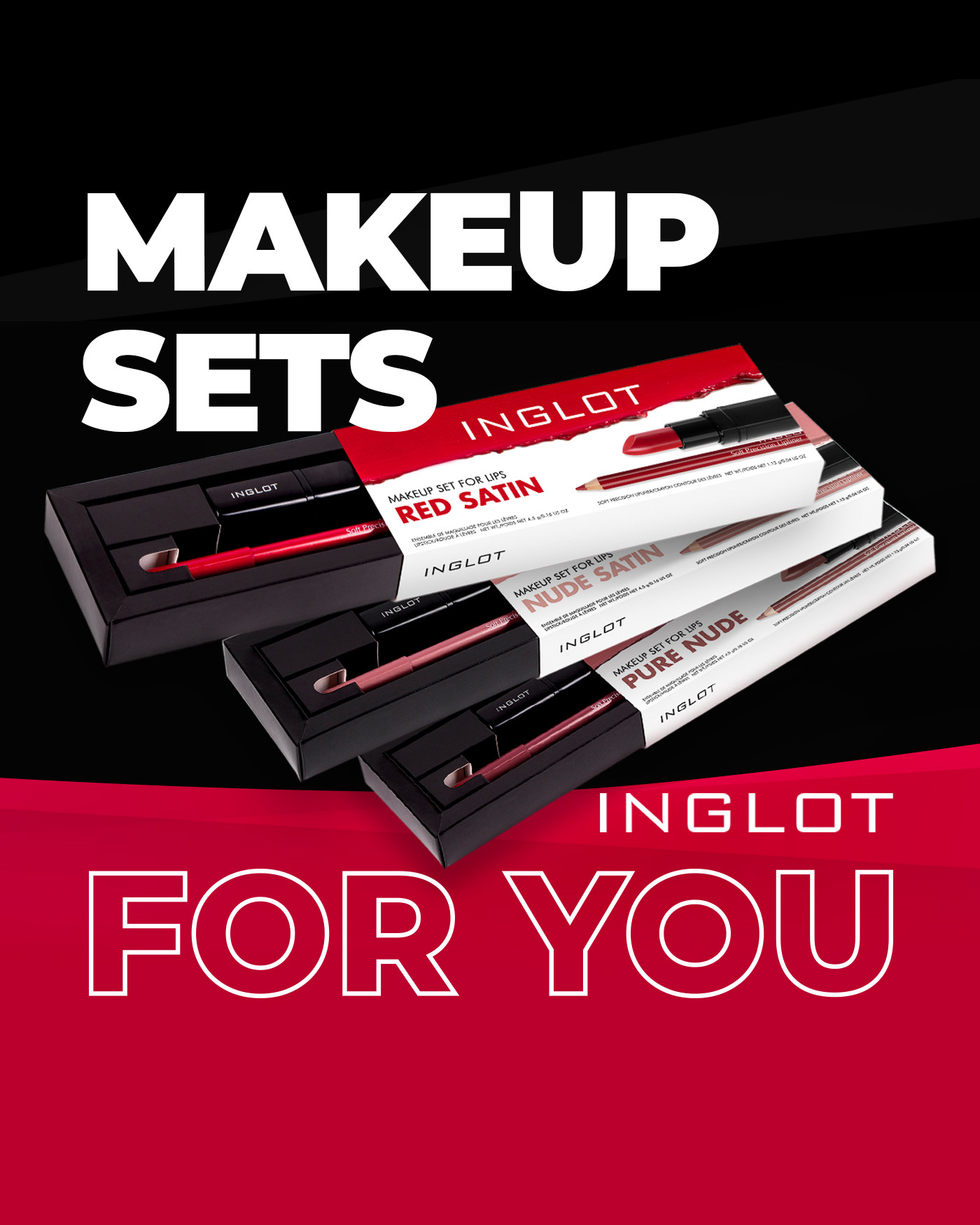 Jeśli Twoim priorytetem są usta postaw na połączenie Konturówki do ust z pomadką w modnym odcieniu różu, beżu lub wyrazistej czerwieni. Jeśli chcesz olśnić wszystkich swoim spojrzeniem, wybierz zestaw do oczu z Konturówką do powiek w żelu AMC lub Tusz do rzęs FALSE LASH EFFECT w towarzystwie konturówki do powiek KOHL. Jeśli to pielęgnacja jest dla Ciebie najważniejszym elementem dnia, wypróbuj nasze zestawy mini produktów z serii INGLOT Lab.